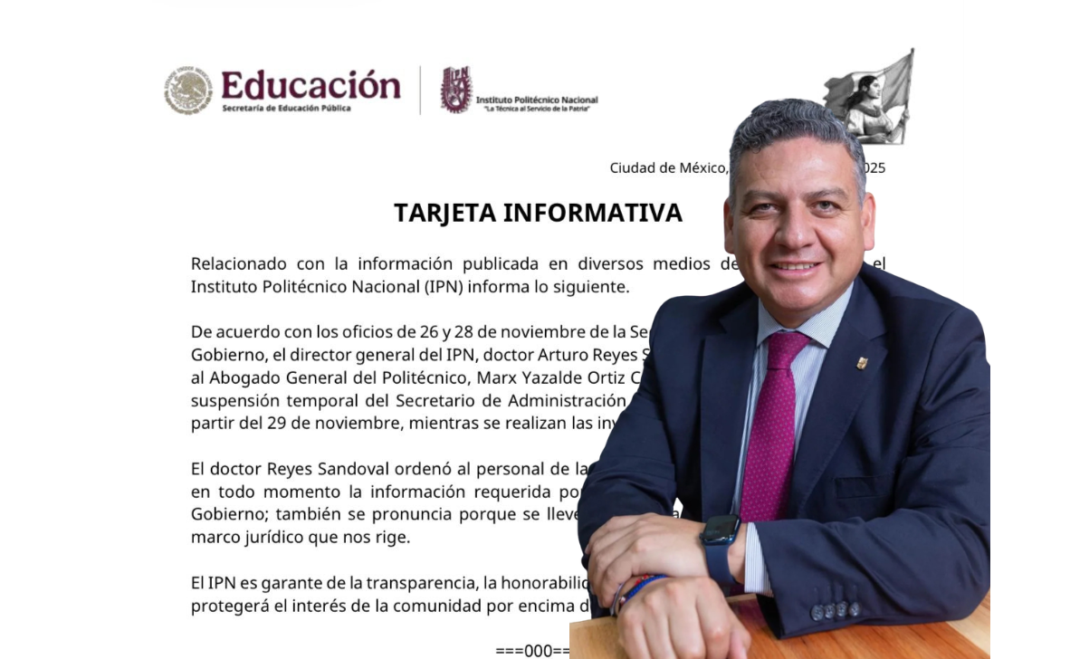 El secretario de Administración del IPN, Javier Tapia Santoyo, fue suspendido temporalmente de su cargo por orden de la Secretaría Anticorrupción y Buen Gobierno, mientras se investiga su presunta participación en hechos de corrupción.